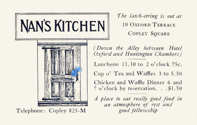 In 1925 the pair seemed to become more serious about the restaurant business, opening a second tea room called Nan’s Kitchen Too at 3 Boylston Place. The next year the original Nan’s remained open all summer for the first time. The following year it was remodeled to resemble an outdoor garden containing a small cabin where a Black woman prepared the waffles, an arrangement also in use at the Boylston Place Nan’s. (Shades of Georgia’s Aunt Fanny’s Cabin? I would hope that Nan’s Black cooks were not costumed as Mammys!)