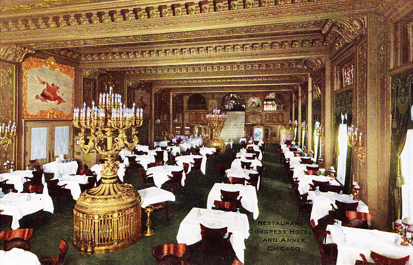 Although lighting experts say it’s all about the light, that has not stopped restaurants from using eye-catching novelty fixtures. Nothing stands out like the “light trees” used in luxurious dining rooms such as one in the Congress Hotel ca. 1915 [pictured above]. Wagonwheels also come to mind as one of the most overused examples, but there have been many others, such as Japanese lanterns, glass footballs, and battered brass buckets.