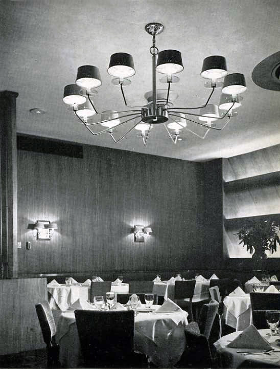 By the 1920s lighting had become an art. The best lighted restaurants were carefully designed using various types of illumination. Emphasis shifted from fancy light fixtures such as chandeliers to the quality of light that fixtures gave. The goal espoused by modern lighting experts and designers became to have adequately bright, but not glaring general illumination, with soft, warm lighting focused on the table. Around 1950 Fritzel’s in Chicago was designed using sophisticated lighting which combined ceiling and wall fixtures with recessed lighting from an architectural feature. [pictured]