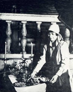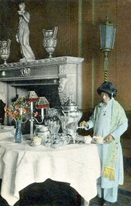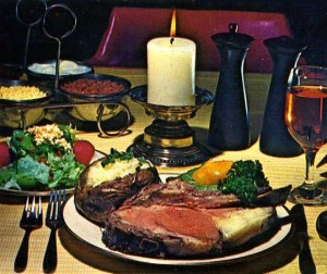 I ate there just once, in the 1970s. I wanted to experience eating in one of the screened-in log huts in the restaurant’s back yard (pictured, courtesy Esley Hamilton). Even then they seemed quaintly out of sync with the times. I have no idea what I ate. What sticks in my mind is the elderly woman alone in the next hut with her dog. I remember a tall, white coated waiter bringing the dog’s dinner, a large serving of prime rib.