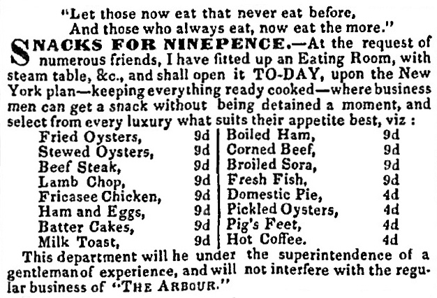 1847 Luxury comes to Baltimore with the opening of the Parisian Restaurant with a “French Cook.” As in Europe, Ladies (accompanied by Gentlemen) are to be honored in a private parlor “where it is hoped that they will be able to enjoy the luxuries of Oysters, Game, etc., from which they have been heretofore excluded.”