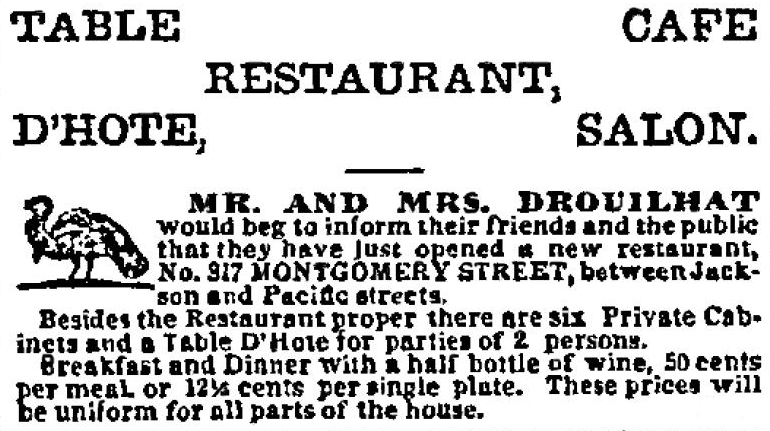 1864 To raise funds for Union soldiers, volunteers organize a fair in Brooklyn featuring a New England Kitchen. Crowds pack the 1770s “theme” restaurant where women in “quaint attire” serve pork & beans, pumpkin pie, and doughnuts to guests who eat with two-tined steel forks from the olden days. — In San Francisco, a French couple open a new restaurant and salon (see below — Is it merely linguistic confusion or are they offering wine with breakfast?).