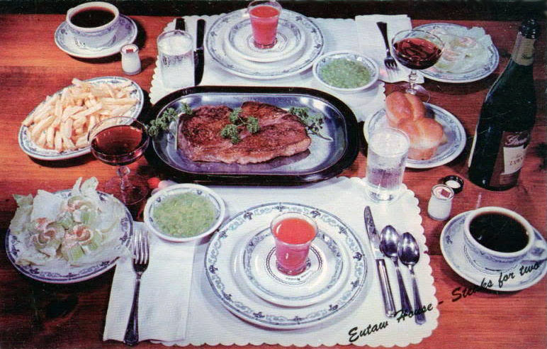 Heavier, more substantial, and often heated Appetizers seem to have been introduced post-WWII mainly by restaurants designated as Polynesian, Cantonese, and Mexican/Latin. In 1960 New York’s La Fonda del Sol offered appetizers such as Avocado Salad on Toasted Tortillas, Little Meat and Corn Pies, Grilled Peruvian Tidbits on Skewers, and Tamales filled with chicken, beef, or pork. A 1963 menu from a Polynesian restaurant called The Islander dedicated a whole page to its “Puu Puus (Appetizers)” that included ribs, chicken in parchment, won tons, and fried shrimp. The assortment was quite similar to the offerings at Jimmy Wong’s Cantonese restaurant in Chicago shown above.
