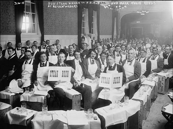 I always find it difficult to judge menus from the 19th century because our eating habits, food preferences, and food resources have changed considerably since then. It is difficult to decide whether any given menu is fine, average, or poor. The following menu was designed by a hotel steward (stewards were in charge of expenses) for a banquet in 1893. Almost certainly wines would have been served with the seven courses (which are Soup, Fish, Roast, Punch, Entree, Dessert, and Coffee).