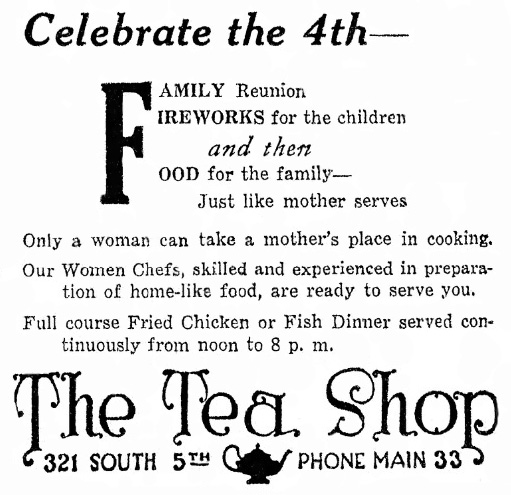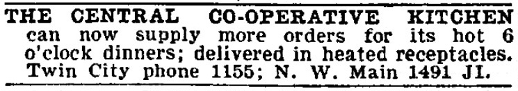 Despite failures aplenty, interest in home delivery of ready-to-eat meals did not disappear, and grew even stronger in the early 20th century propelled by the “servant shortage.” Co-operative projects, such as the Women’s Industrial and Educational Union in Boston and the Central Co-operative Kitchen in Minnesota’s Twin Cities tried to take up the slack. And a number of women around the country began to run small enterprises out of their home kitchens, hiring boys on bicycles to deliver within relatively short distances.