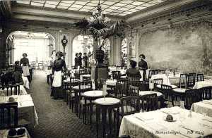 Always proud of its continental delicacies, New York’s Rumpelmayer’s was related (exactly how I’m not sure) to sister tea shops in London, Paris, and on the Riviera. The original Rumpelmayer’s was begun by an Austrian pastry cook in the German resort town of Baden-Baden in the last quarter of the nineteenth century. It then followed its Russian clientele to Cannes and Nice, then later to Mentone and Monte Carlo. In 1903 a shop was opened on Paris’s Rue de Rivoli (pictured, somewhat later) and in 1907 on St. James Street in London. Parisians, infected by Anglomania in the early 20th century, eagerly adopted the afternoon tea custom, in this case reputedly known as having a feeve o’clock-air at “Rumpie’s.” Though it was rated slightly less chic than the Ritz, it attracted mobs of fashionably dressed women who paraded their outfits up to the counter where, according to custom, they speared their chosen pastries with a fork.