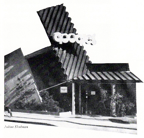 The design of coffee shops was nicknamed “Googie” after architect John Lautner’s 1949 unique Los Angeles creation bearing that name. It featured expansive glass window walls, unusual angles and roof lines, prominent signs, and bright colors. [partial view shown above — it extended farther to the right]