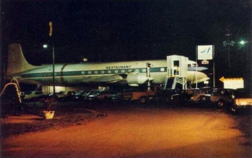But why not a restaurant in an airplane? It was bound to happen, given the modern fascination with flight. Already in 1942 there were said to be a chain of drive-in theaters for airplanes in Flushing NY, and another one opening in Asbury Park, NJ, in 1948. In Elwood IN a drive-in restaurant for both airplanes and cars debuted in 1954.