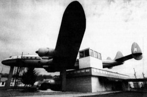 Chicago’s Sky-Hi Drive-In and Restaurant, operated in a salvage-yard DC-7, was opened in late 1963 by the Dimas brothers, Jim, John, and Chris, who evidently spent way too much money renovating and outfitting the 110-foot long plane with all-electric cooking facilities. They perched it on top of a small luncheonette that served as the drive-in part. The fuselage was to provide a fine dining experience, though it’s doubtful that happened. Located on a lot that previously held an auto body shop, it may not have been in the most favorable site. Whatever the problem, less than two years after opening it was out of business.