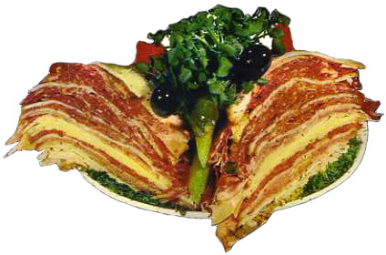 Hungry patrons could feast on bowls of sour cream with banana, fresh vegetables, or cottage cheese. Or on “Forshpies (before getting serious . . . a treat!”), in other words appetizers ranging from a dish of Sweet Gherkins (.35) to Chopped Herring (.65) or a Jumbo Shrimp Cocktail (.95). Along with shrimp, the deli also served non-kosher dishes such as Canadian Bacon Steak and Lobster Surprise, one of the most expensive choices at $5.95. Parties of six could feast on a $25 “Sandwich Supreme, served on a sterling silver platter (which remains our property.)” Like delis generally, sandwiches formed the bulk of menu offerings.