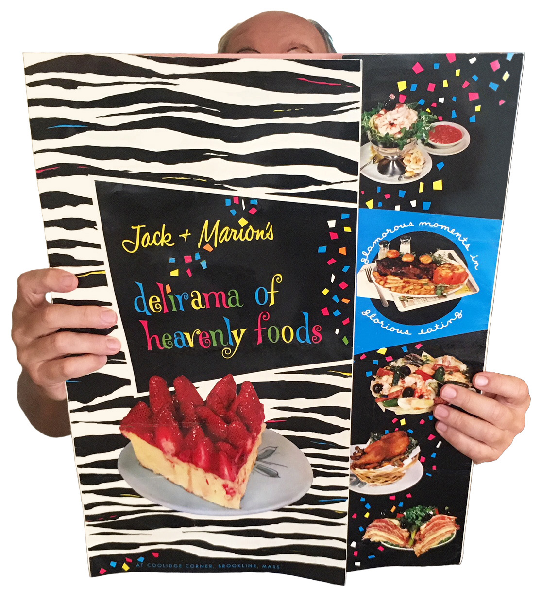The gigantically oversized menu shown here from Jack & Marion’s Delirama in Brookline MA is 21.5 inches tall, 34 inches wide fully opened, and contains over 230 items not counting drinks, desserts, or carry-out Delicacy Platters.