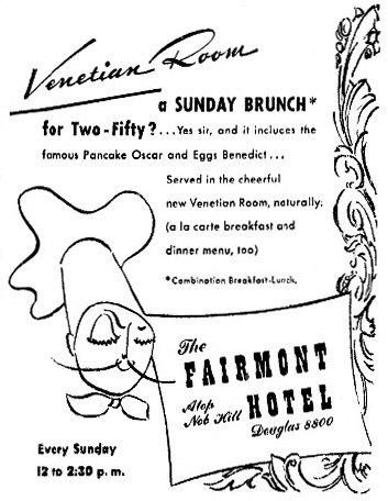 A year after Maddox’s column, the dish appeared on the brunch menu of San Francisco’s Fairmont Hotel for the high price of $2.50 (the average daily gross income in 1947 was about $12).
