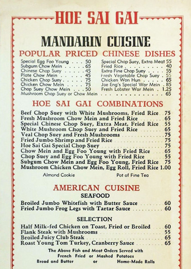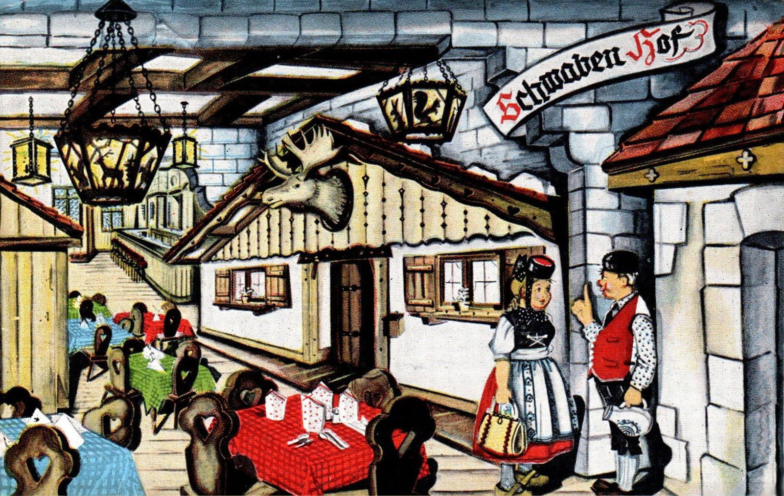 The 1920s through the 1950s saw the proliferation of restaurant types that were definitely non-ethnic such as tea rooms, cafeterias, steak houses, hamburger and hot dog stands, fried chicken places, lunch counters, diners, drive-ins, and chain restaurants. Many Greek-American proprietors avoided putting any remotely Greek dishes on their menus until the 1960s. Other restaurants serving “foreign” food added sections with American dishes to their menus [menu above, Chicago, 1941], while others dished up a stereotyped version of ethnicity [see Milwaukee’s Schwaben-Hoff shown above].