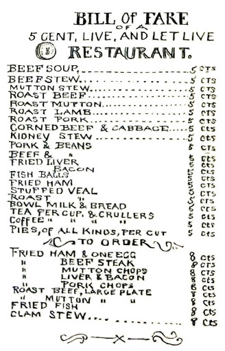Much more common were the eating houses that served food similar to what would be found in England, consisting mainly of meat and game, simply prepared, with little in the way of sauces or seasonings. [see NYC Bowery restaurant, 1887] Oyster cellars provided the fast food of the day.
