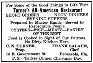 With the large number of immigrants arriving in the late 19th and early 20th century, it is hardly surprising that many of them took up restaurant keeping. But this did not necessarily mean that they offered anything other than standard American fare. World War I revealed an undercurrent of prejudice against foreign eating places that had earlier been aimed at Asian restaurants on the West Coast. The negative attitudes may have driven some non-natives to “Americanize” their names and menus. Other restaurant owners, probably of American birth, played to nativist prejudice. [See 1918 ADV; Turner’s chef was born in France but naturalized shortly before the advertisement appeared.]