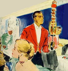 The popularity of flames at the table and other forms of tableside food preparation grew in the 1950s, 1960s, and 1970s. The full show was described by the proprietor of the Bubble Bar in Akron OH in 1952: “Just as your Flaming Sword Dinner is about to be served, the Rajah (that’s my assistant) and I dim the house lights and approach your table, sword in hand aflame with choice morsels of lamb, beef tenderloin or chicken. . . . And of course, following such an adventure in dining, you wouldn’t think or dare to order any dessert but our Flaming Cherry Jubilee or Flaming Crepes Suzette.”