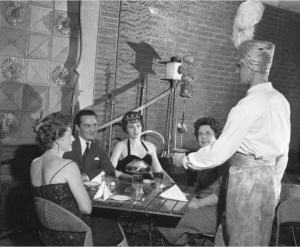 One of the most flamboyant sorts of tableside service is the presentation of food on flaming swords. It represented the consummate display of tableside theatrics, particularly at Chicago’s Pump Room of the late 1930s and 1940s. Master of ceremonies Ernie Byfield asserted that he preferred to host “laughing eaters” rather than “grim gourmets.” He was quite frank about the degree of pretense involved with tableside service at the Pump Room, implicitly acknowledging that formal French service was out of step with mainstream American culture. [Pump Room flaming swords, 1943]