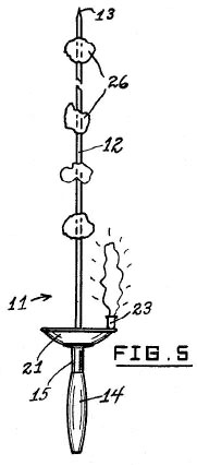 How does the flame work? I always wondered. As a patent applicant explained, “this is usually accomplished through igniting, immediately before serving, a piece of cotton which, first dipped in alcohol, is wrapped around the base of the sword near the hilt thereof.” However if you adopted another design you could have a wick holder built into the grease drip cup “so that when the skewer is carried in an upright position with cooked meats or other food articles impaled thereon, the wick, previously soaked with rum or brandy, may be ignited, providing a dramatic torch-like effect as the skewer is carried from the kitchen to the table.” Quite frankly, that would be my preferred sword because I like the way it catches grease and eliminates cotton wads thereon.
