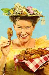 And, yes, that is also true of Chicken in the Rough, a franchised process for preparing fried chicken. As recently as now, Palms Krystal Bar & Restaurant in Port Huron MI offers “The World’s Most Famous Chicken Dish,” as it has for decades. In 2000 a Palms order consisted of an unjointed half fried chicken, with shoestring potatoes, hot bun, and jug of honey. Two orders cost $9.99 and they even threw in free coleslaw. In the 1930s an order usually was priced at 50 cents. [above, 1940s menu from an Arkansas restaurant]