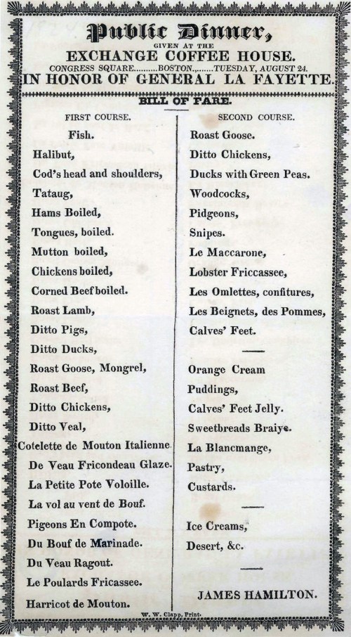 1824 France’s marquis de Lafayette, friend of the American revolution, pays a return visit to the US and is feted with a dinner at Boston’s Exchange Coffee House which features an astonishing selection of American and French dishes.