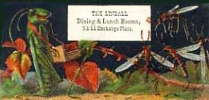 It was also clear that a square meal was not the same thing as a lunch. Back in 1858 the What Cheer House advised that in addition to three squares a day, regular diners there might also get “a lunch between meals, if they can keep on the right side of the Cook.” A lunch was regarded then almost as a snack. Boston’s Lindall “Dining & Lunch Rooms” had three departments, one “for the ‘regular square meals,’ one an oyster counter, and one “devoted to hot lunches of smaller orders of almost every dish.”