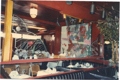 In 1979 Nucleus acquired new partners, the Venieros, who introduced fine vintage California wines, hooked up the restaurant with the Garlic Festival, and expanded the premises. Evidently, though, it remained unbeautiful. According to the Los Angeles Times in 1976, the dining room was windowless and “The front door leads you down a long corridor that makes you think you’ve walked in the back door by mistake.” In 1988 it sounded pretty much the same. A review by Alan Richman describes the entrance as “a nightmare, a series of twists and turns along a gloomy cinder-block passageway,” adding that the uninviting exterior was “white cinder-block, the front door solid black, the overhead awning worn out.” (He liked the place once he got settled.)