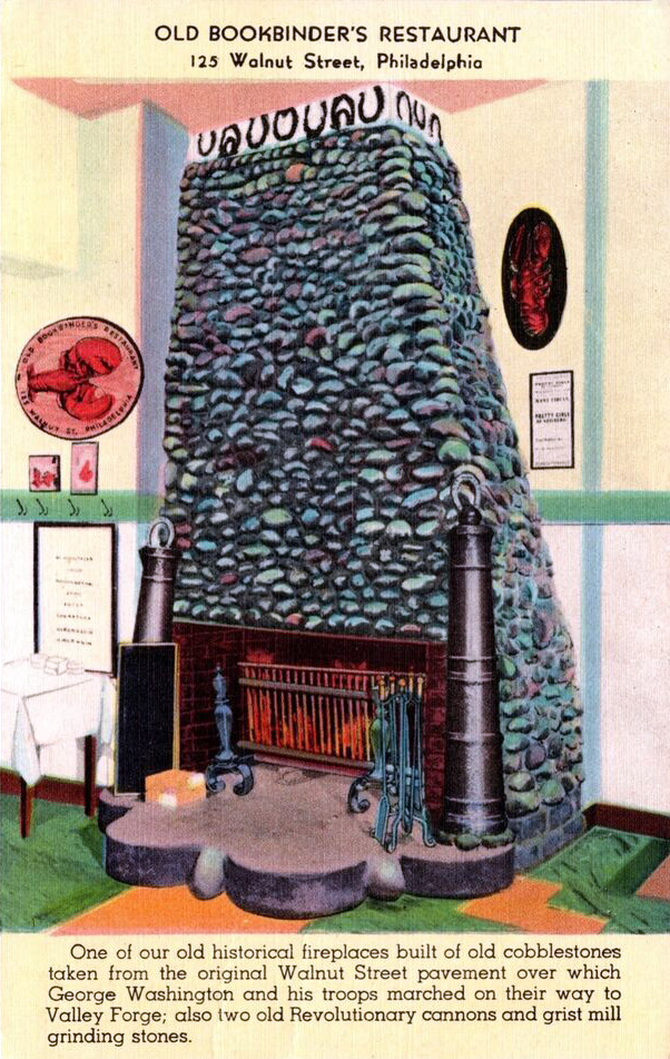Obviously the building occupied by Old Original Bookbinder’s itself looked aged, and the memorabilia contributed to a sense of age. Other historical attractions were the fireplaces made of old cobblestones taken from Walnut Street. The fireplaces probably dated back to 1915 or 1916 when the city was removing cobblestones from streets. A 1916 advertisement promised “A Beefsteak Dinner in the ‘Maine Woods’” cooked at that room’s fireplace, with steaks and chops grilled in the fireplace and served with oysters, radishes, celery, and hot biscuits baked on the hearth.