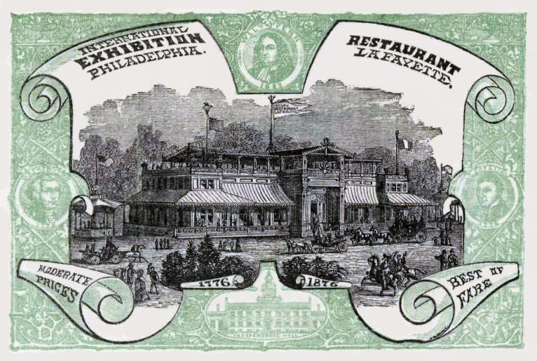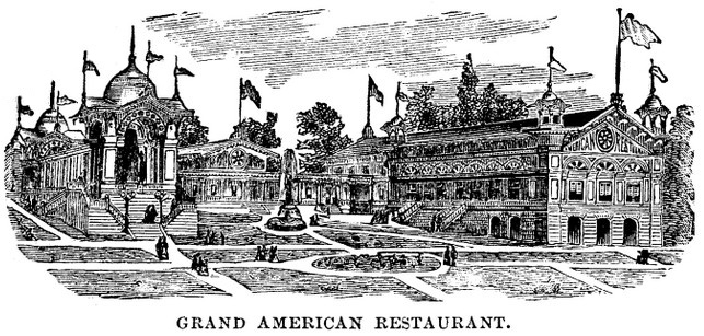 The dominance of elite restaurants at the Centennial may have been part of the same plan of discouraging, or simply ignoring, working class patrons. Perhaps the restaurant that was most resented was the “Parisian” restaurant, Aux Trois Frères Provencaux [shown here and at top]. It had a famed past dating back to the 18th century, though, unbeknownst to most Americans (if they even vaguely knew of it), it had changed hands many times, lost much of its splendor, and closed several years before the Centennial.