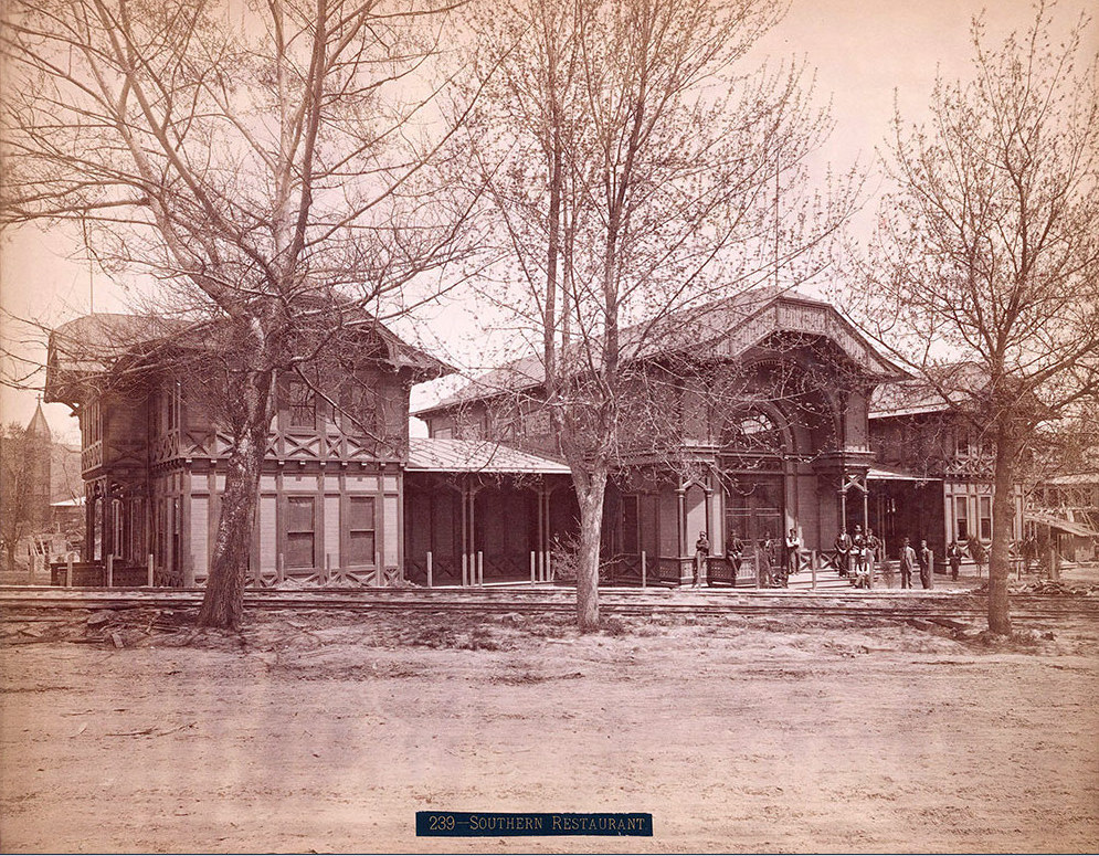 The other large eating place, the Restaurant of the South [shown here], seemed to be predicated on a fascination that Northerners would have with Southern culture (including an “Old Plantation Darkey Band”), along with the belief that Southern visitors to the Centennial would want to group together in their own place. But if it was the case that few Southerners visited the fair [Noe, cited above], this would probably have taken a quite a toll on the Restaurant of the South.