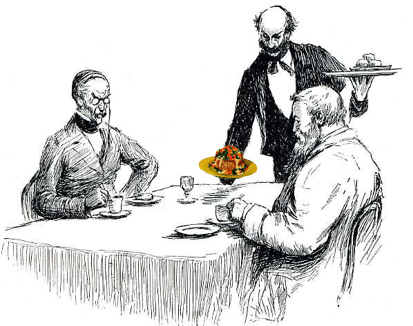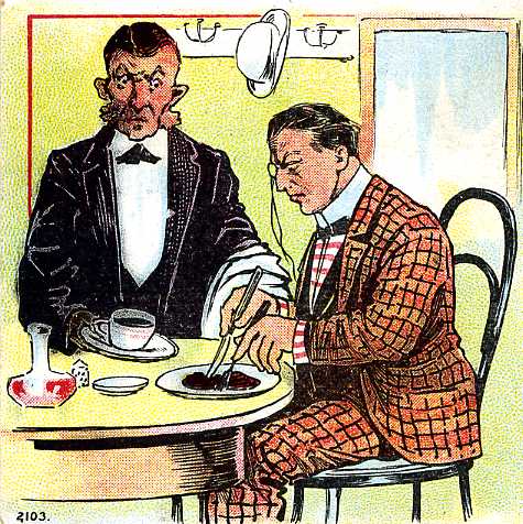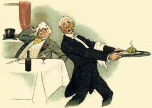 1903 “We are now in the season when the discreet diner shudders at the thought of the typical table d’hote, with its greasy soup, its fragment of doubtful fish, its over-rich entree submerged in thick gravy, its choice of roast chicken or roast beef – which taste exactly alike – its impossible pudding, equally impossible pie or cubic inch of factory ice cream, its microscopic fragment of crumbly Brie, dry Swiss, or leather-colored Camembert cheese, and its demi tasse of black coffee.”