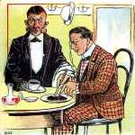 Observations about bad food in restaurants span the ages. But in gathering together these comments I noticed a curious thing. Despite the incursion of frozen food and other shortcuts into 1950s restaurant kitchens, that decade’s reviews were strangely upbeat. Not totally surprising to me because I consider the 1950s the “Everything is ok!” decade. For instance a newspaper review in 1959 noted that Tad’s Steak House in Chicago featured “low price steak on assembly line basis,” but removed all the negative implications by immediately asserting “you seldom find a toughie.” Yet, as diners from every other decade reveal below, eating out has always been chancy.