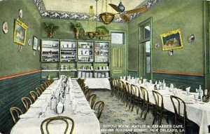 It was a common practice to save tables for prominent business men who gathered at the same table daily. In cities with numbers of German-American settlers, such as St. Louis and Washington D.C., the table was known as a Stammtisch and the diners as Stammgäste. At a restaurant in St. Louis conducted by Detlof von der Lippe, tables in alcoves were reserved for different professions. An inset in the 1906 postcard below shows an alcove named The Grind Stone. In the background is The Roost, reserved for tailors, while lumber men sat in The Hoo-Hoo. Which profession met in The Grind Stone is anyone’s guess.