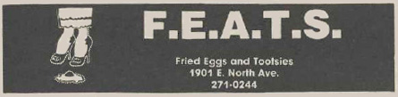 Nonetheless, the Public Natatorium became a must for tourists attracted by the dolphin shows and as far as I can tell did reasonably well overall. At some point after its opening, G&G Enterprises opened a third place with the characteristically jocular 1970s name Fried Eggs & Tootsies, aka F.E.A.T.S. Located near the Milwaukee campus of the state university, F.E.A.T.S. was mostly a drinking spot with bands.