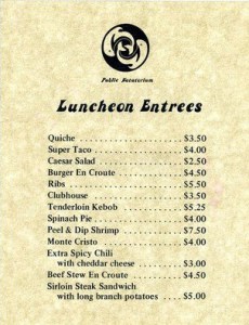 As it happened, the menu at the Public Natatorium – as the new 1979 restaurant was named — borrowed heavily from J. J. Garlic’s. This was especially the case on the Natatorium’s “gourmet” second level where prices ran considerably higher than on the lower level.