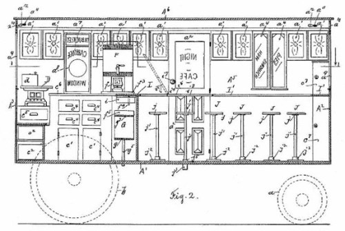 The first wagons tended to be cobbled together out of spare parts, but it wasn’t long before enterprising New Englanders realized the potential for profit in manufacturing them. Worcester, Massachusetts, became a center of production for a number of companies, as detailed in the classic book American Diner by Richard Gutman. By 1892, Worcester lunch wagon maker Charles Palmer was supplying his patented lunch wagons to many parts of the country. Some of them had elaborately painted exteriors that made them resemble circus wagons. Larger ones tended to have enough room inside to allow a few customers to sit at narrow side counters, while in older and homemade models orders were handed out a window.
