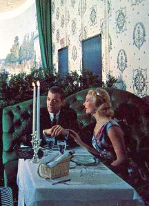 Things loosened up not long after Emily’s edict, and celebrations in romantic restaurants increased in the 1960s. Yet it wasn’t until the 1970s that the typical Valentine’s Day restaurant experience we know today with its wine, candlelight, and soft music became popular. [see London House, Fort Worth TX, 1971] In the late 1970s and 1980s February ads for candlelit dinners “for lovers only” appeared frequently.