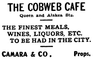 I’ve also found Cobweb Saloons in Las Vegas NM, Lincoln NE, Spokane and Tacoma WA, San Antonio and Beaumont TX, Albany OR, New Orleans LA, and Honolulu HI [advertisement, 1905].