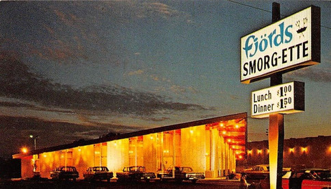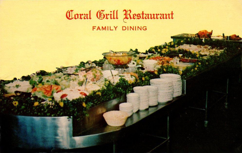 The hygienic sneeze-guard came into use after World War II, first in schools and hospital cafeterias. Although a version of it had made its appearance in commercial restaurants in the early 20th century with the growth of cafeterias, many restaurants served food buffet style into the 1950s and 1960s without using any kind of barrier. The Minneapolis Board of Health required that uncovered smorgasbords either install sneeze-guards or close down in 1952, but it seems that their use did not become commonplace nationwide until the 1970s. Eklund’s Sweden House in Rockford IL thought it was novel enough to specifically mention in an advertisement in 1967. Massachusetts ordered them to be used in restaurants with buffets or salad bars in 1975.