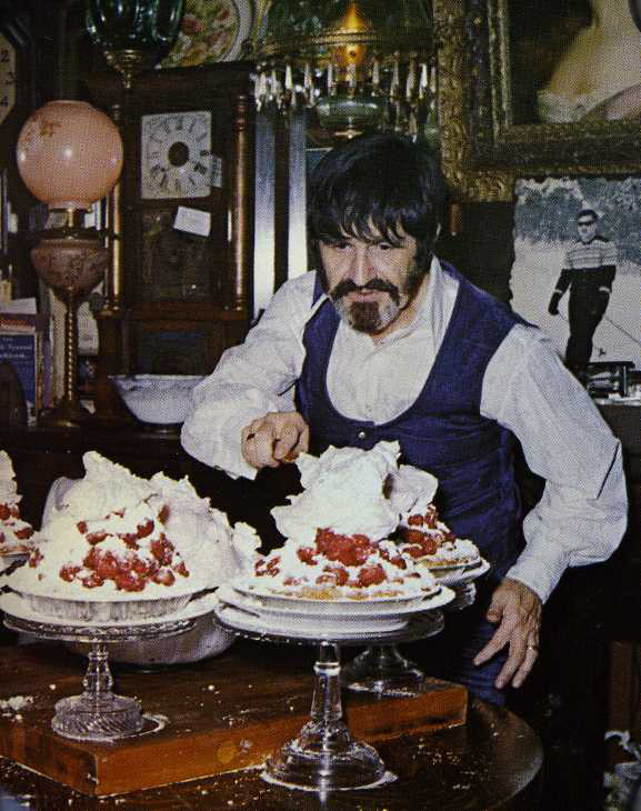 Shambarger'sClydeThornburg1971Making ten or more costume changes an evening, as a pirate, Tiny Tim, a Hawaiian dancer, etc., John chopped and mixed while singing, pattering, or loudly playing records keyed to each dish. Sometimes he told jokes, kissed women diners, or screamed ‘Aaayyyyy’ in people’s ears in concert with a Spike Jones record.