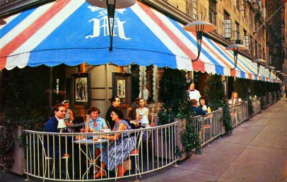 Louis Sherry claimed to have set up the first sidewalk café in this country, outside his Fifth Avenue restaurant in 1900. He wasn’t actually the first. In 1891 women out shopping in Manhattan liked to “eat al fresco under the vineclad, bush-shaded bower” in front of the Vienna Café. Not too surprisingly, the warmer climates of Florida and California proved most hospitable to sidewalk dining. The custom did not really catch on in a big way across the U.S., though. Those sidewalk cafes that were created in the mid-20th century, such as the St. Moritz Hotel’s Café de la Paix (NYC, pictured), usually advertised their Continental atmosphere, suggesting that eating on sidewalks had not yet earned true American status.