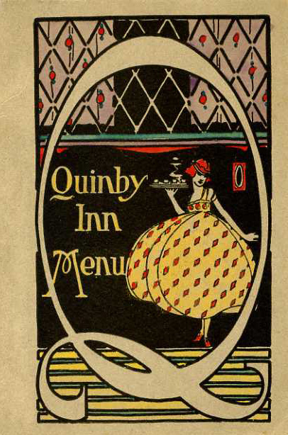 As for food, apart from popularizing eating cake and ice cream at any time of day or night, tea room food was a departure from typical lunch rooms and restaurants of the early 20th century that served fairly heavy meals based around meat. Although meat was certainly served in tea rooms, patrons also had many other choices. A 1920s menu from The Quinby Inn (shown above) — popular with students at Goucher College near Baltimore — offers Tenderloin Steak and Roast Pork, but also many other choices, with quite a few of them revealing the popularity of sweet food. Among them are 12 desserts, 22 salads, many of which involved mixed fruits and whipped cream, and 22 sandwiches, including Olive & Egg and Sliced Pineapple (no, not together!).