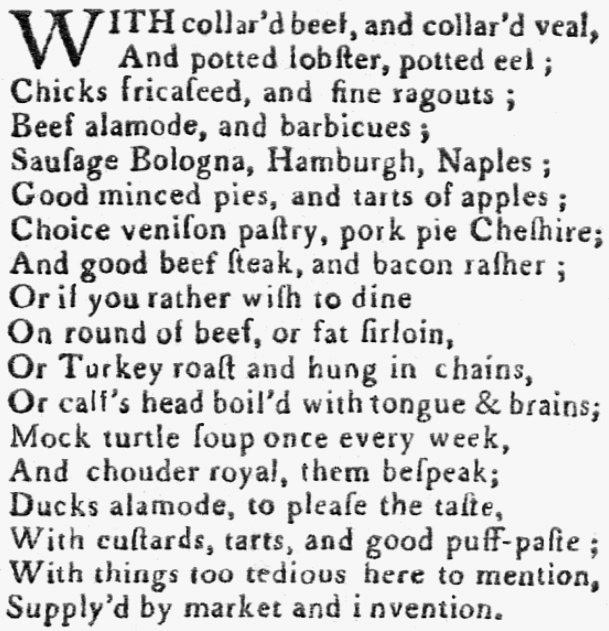 Of course, restorators also provided a wide range of dishes beyond soup. Pastries were specialities too. Boston’s Dorival & Deguise advertised in 1796 that they furnished “every thing that the season affords, such as Meat, Poultry, Fish, Vegetables, Fruit, etc., which will be varied with a great variety of excellent Creams, Pies, Cakes, etc. – such as never fail of pleasing the palate of Gentlemen who are in, or out of Health.” Note that American cooks of that time were not known for their skill in creating pastries.