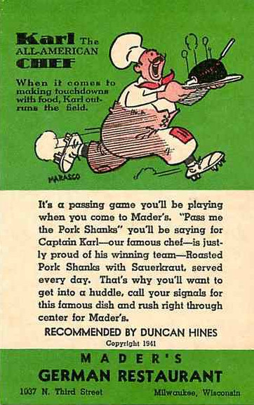 Charles Mader was known for his belief in advertising, often remarking, “If your business is not worth advertising, advertise it for sale.” Beginning afer Prohibition, Mader’s would intensify its advertising program and accentuate its Germanness, following a kind of reverse assimilation common to other German-themed restaurants in the US. Very likely this reflected a proportionate shift in patronage from German-American Milwaukeans to a wider clientele of conventioneers, traveling businessmen, and tourists of all stripes looking for an identifiably ethnic experience. The trend would continue: a 1968 newspaper story reported that at Mader’s and Karl Ratzsch’s, mostly patronized by tourists, German dishes were popular, while at restaurants patronized exclusively by Milwaukeans such as the Fox and Hounds, filet mignon and lobster tail were favorites.