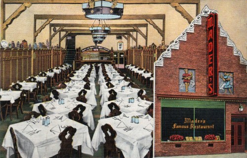 Although many restaurants get a good share of patronage from out-of-towners, relatively few located in America’s midsection make a determined bid for nation-wide recognition. Mader’s was one of those that did so successfully. A late 1920s photograph in the historic photo collection of the Milwaukee Public Library shows the restaurant with a prominent “Tourists’ Headquarters” sign in its front window. In 1929, a newspaper item suspiciously resembling an advertorial (publications didn’t identify them as such then) claimed that Mader’s had won a reputation for hospitality extending “the length and breadth of this land and to distant lands as well.”
