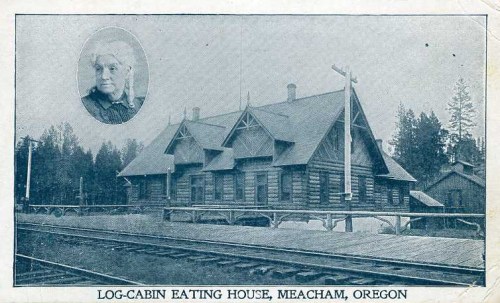Next they managed the O. R. & N.’s dining facility at Bonneville. When the railroad closed it down, they returned to Eugene as managers of another hotel there. We then find Kate running the student dining halls at the University of Oregon, Eugene. Next, in December of 1894 she went back to work for the railroad, choosing furnishings for the new log hotel and restaurant in Meacham. She managed it from its inauguration in January 1895 until it was destroyed by fire in 1902.