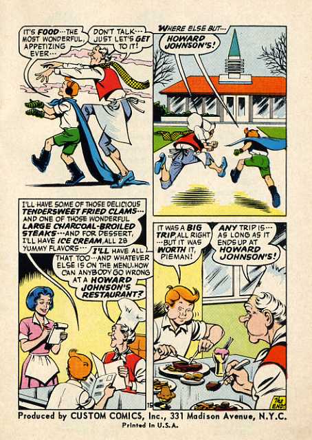 Children’s menus went beyond food listings to include games, puzzles, and pictures to color. Some came in the form of masks or paper toys to be assembled. The Howard Johnson’s chain put its children’s menu in the centerfold of a comic book in which an adventure concluded with a hefty HoJo’s meal of fried clams and a “large charcoal-broiled steak.” Odd, since steak was not on the children’s menu.