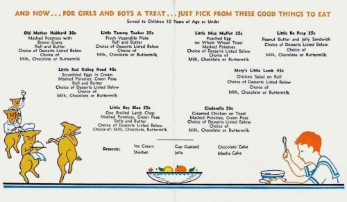Printed children’s menus, based on the idea that children liked to choose their own meal, arrived in the 1920s, often at department stores and other restaurants patronized by women of comfortable means who were out shopping. In Boston, Filene’s and the Shepard Store offered children’s menus. In 1927 Shepard’s offered a children’s menu in its 6th floor Colonial Room with specials such as a 50-cent meal of Poached Egg with Creamed Spinach, Baked Potato, Bread & Butter, and Milk.
