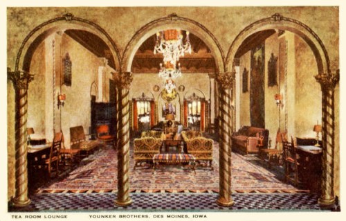 A shining example was the tea room at Younkers Department Store in Des Moines, Iowa. Although residents of large coastal cities might imagine that their stores were the most luxurious and elegant, this was not strictly true. Department stores in smaller cities often had much higher status and influence in the eyes of their customers. In the case of Younkers, the flagship store was located near the middle of the state, making the store accessible to the entire population of Iowa. It is hardly surprising that it adopted the motto “Iowa’s Foremost Mercantile Establishment.”