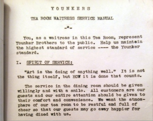 Recently I found a Tea Room Waitress Service Manual for Younkers, probably dating from the 1930s. [part of page 1 shown] It reveals the high standard of service expected from the staff, despite the fact that prices were moderate. Though undoubtedly predominantly white and culturally homogeneous, Younkers patrons represented a cross-section of ordinary Iowans. Yet in many ways the tea room aspired to the quality of appointments and service only found in certain expensive restaurants today.